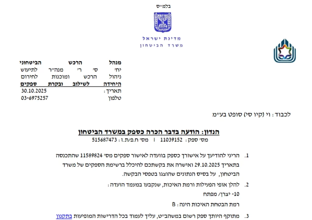 Letter of recognition as a supplier from the Ministry of Defense