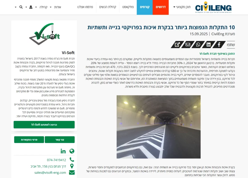 Quality control and quality assurance are a cornerstone of any serious construction or infrastructure project. However, even in projects that are considered meticulous and uncompromising, similar failures repeatedly emerge, causing delays, unnecessary financial costs, a decrease in product quality, and in the worst cases, even real safety hazards. Here are the ten most common failures in the field: